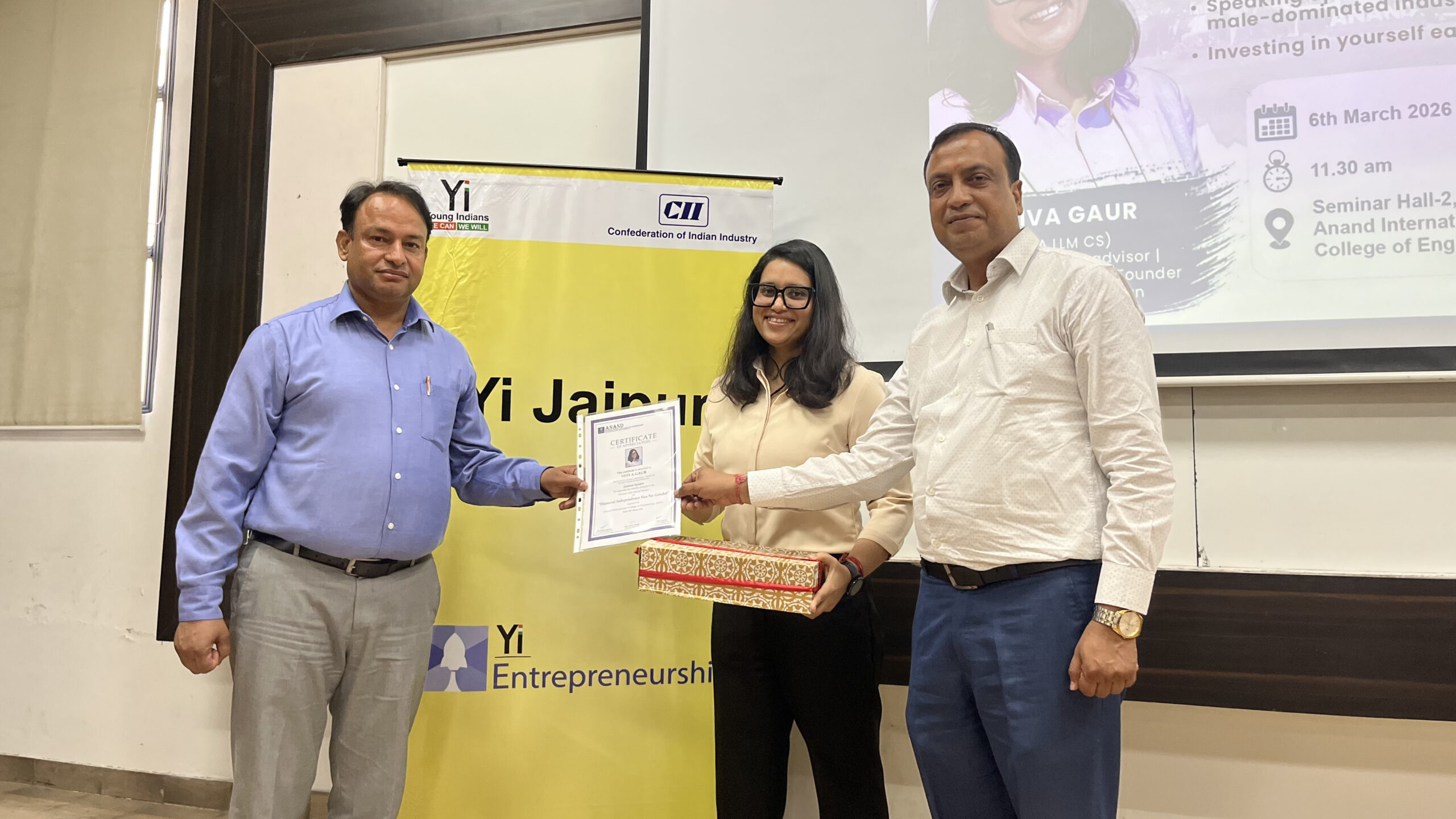 On the occasion of International Women’s Day, Anand-ICE organized a one-day special session on the topic “Financial Independence Has No Gender.” The event was organized in collaboration with Young Indians (Yi), an initiative of the Confederation of Indian Industry. Keynote speaker Shiva Gaur, Corporate Legal Advisor, Mentor, Investor, and Founder of Swachhathon Run, highlighted the importance of financial literacy for students and faculty members, stating that being financially independent is essential for self- confidence, identity, and a secure future. She also discussed women’s economic empowerment and the role of male support. She also addressed the challenges faced by women working in male-dominated fields and encouraged students to invest in themselves from the beginning of their careers and speak confidently. The event was attended by College Principal Prof. Vijay Kumar Sharma and Vice Principal Prof. Praveen Agarwal, along with all faculty members and over 200 students. College Vice-Chairperson Monika Mittal Agarwal appreciated the inspiring and informative session by the keynote speaker Shiva Gaur and motivated the students to become financially aware and self-reliant.